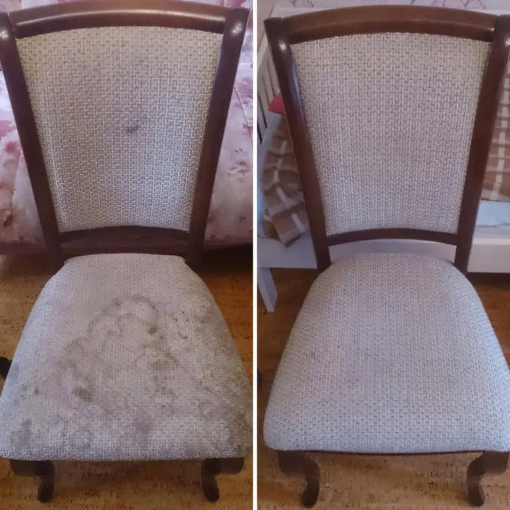 Before / After შედეგმა აჩვენა ქსოვილის ფერის აღდგენა და სისუფთავე. სკამები დაუბრუნდა კომფორტულ და ჰიგიენურ მდგომარეობას ყოველდღიური გამოყენებისთვის.